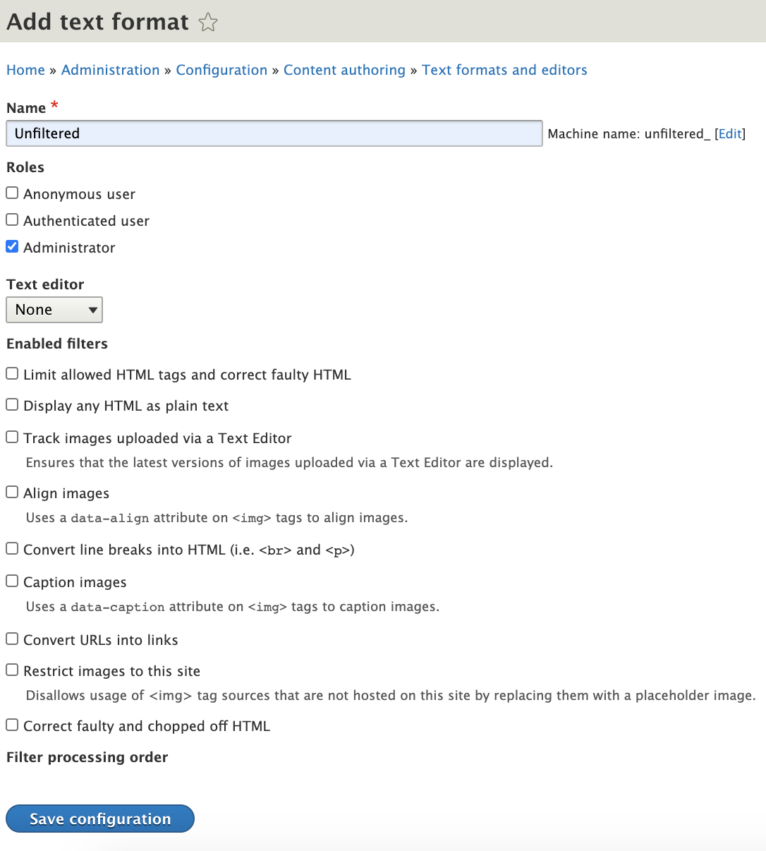 Log into your Drupal admin and go to Configuration > Content Authoring > Text Formats